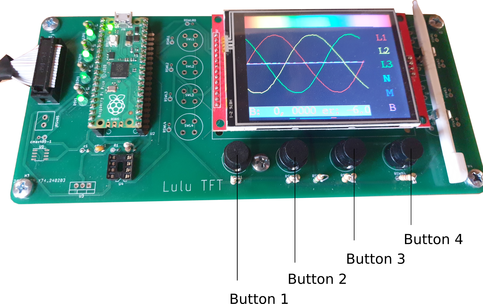 This project uses a RaspberryPi Pico and a 3.25" ILI9341 touch display to enable/disable the relay outputs and display the measured data in a user friendly way ; the 4 buttons are connected on a single ADC pins so that all combinations can be reported.